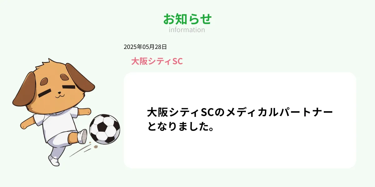 ご迷惑をおかけしますが、何卒ご理解いただきますようお願いいたします。 - 大阪シティSCのメディカルパートナーとなりました。